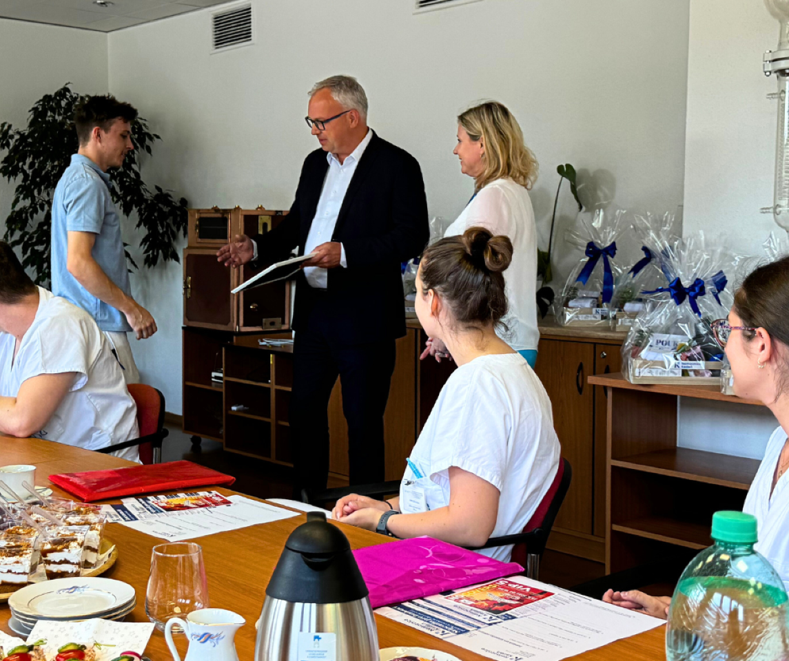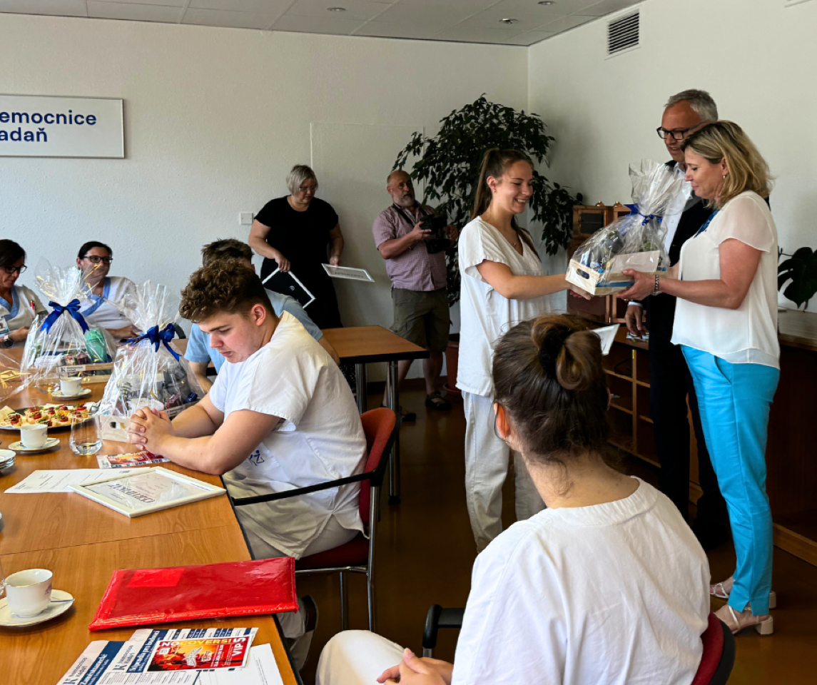 Ve středu 26. 6. 2024 proběhlo za přítomnosti ředitele MUDr., Bc. Petra Hossnera, MBA, hlavní sestry Moniky Grof a třídní učitelky Mgr. Jany Razakowské slavnostní předání certifikátů o absolvování praxe, dárkových košů a poukazu do nemocniční lékárny. Téměř všichni tito studenti u nás zůstávají na letní brigádu a naším přáním je, aby se k nám po škole vrátili. Máme pro ně lákavá stipendia, maximální podporu práce při studiu, možnost zaměstnaneckého ubytování, jistotu stabilní práce a mnoho dalších benefitů.
