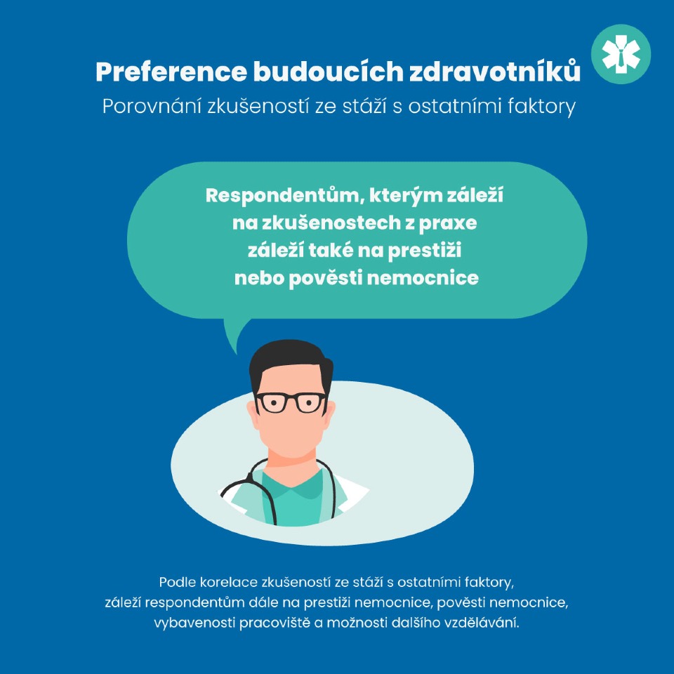 Nejdůležitějším faktorem pro budoucí zdravotníky je Kolektiv a atmosféra na pracovišti. Na druhém místě je „Work-life balance“, což potvrzuje, že mladí lékaři a sestřičky očekávají dostatek času na odpočinek a přiměřený počet nočních služeb. Platové ohodnocení je na třetím místě. Na konci žebříčku se umístily benefity jako náborové příspěvky, služební byt atd., které nehrají velkou roli.