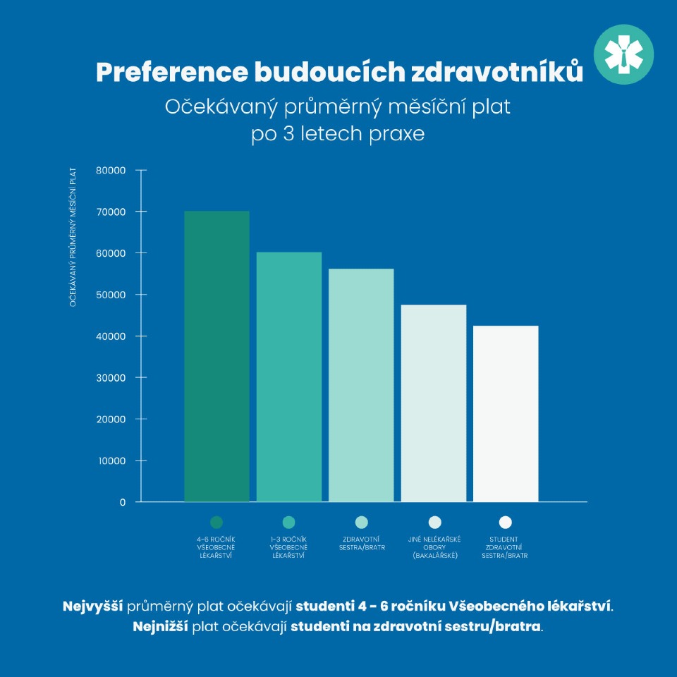 Když jsme se respondentů zeptali, jaký plat očekávají za svou práci po třech letech praxe, dostali jsme velice široké spektrum odpovědí. Nejvyšší plat očekávají studenti čtvrtého až šestého ročníku všeobecného lékařství a to v průměru 70 000 Kč měsíčně. Hned za nimi jsou v závěsu studenti prvního až třetího ročníku s průměrem 60 000 Kč. Okolo 55 000 Kč očekávají plat zdravotní sestry. Studenti všeobecného ošetřovatelství a jiných bakalářských oborů očekávají plat pohybující se kolem 45 000 Kč.
