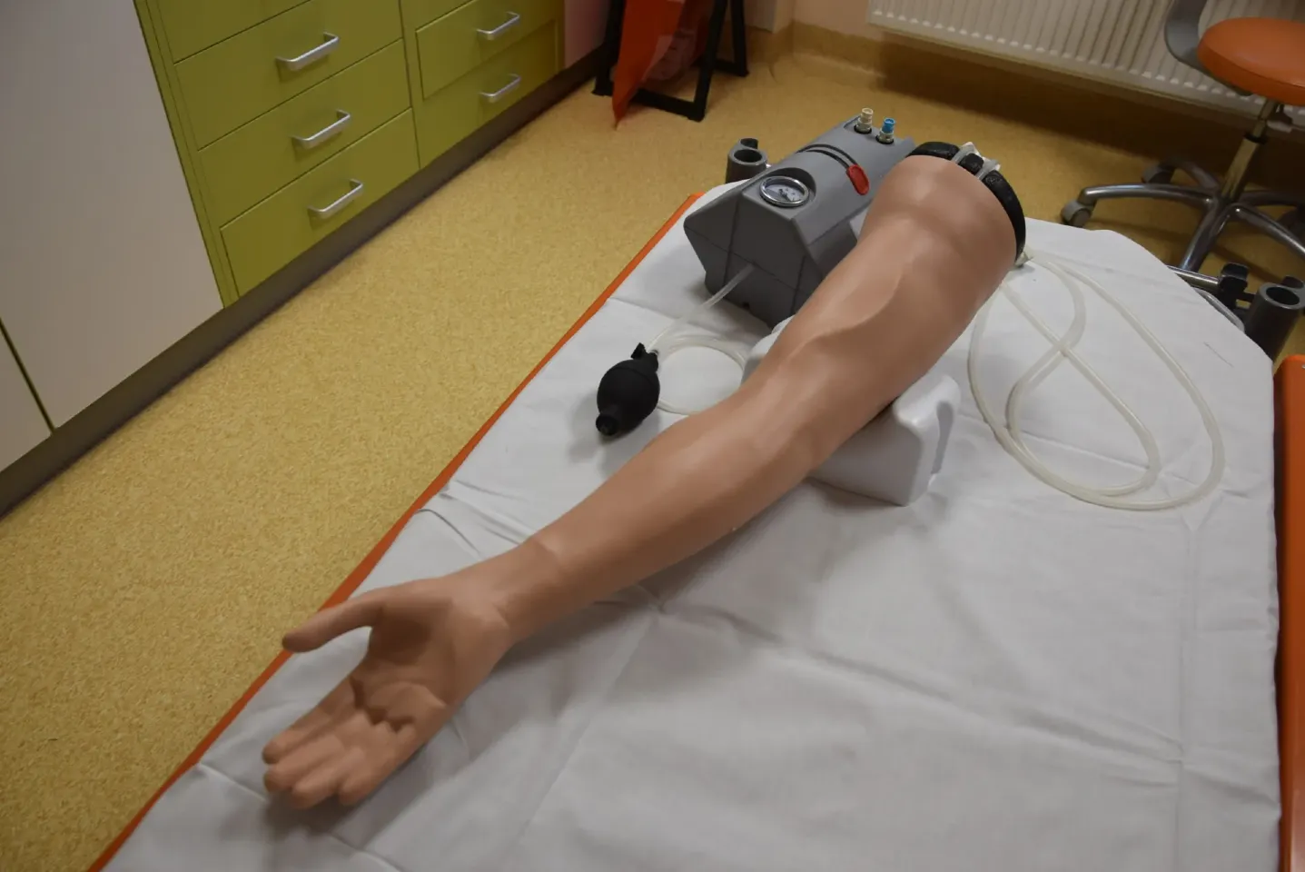 Trenažer ruky na cévní vstupy je gumový, ale velmi realistický. Je pokryt silikonovou kůží a žíly jsou naplněny červenou tekutinou, která vypadá jako krev. Sestry si tak mohou zkoušet zavádět kanyly do povrchových žil, péči o ně, lepení a prevenci komplikací.