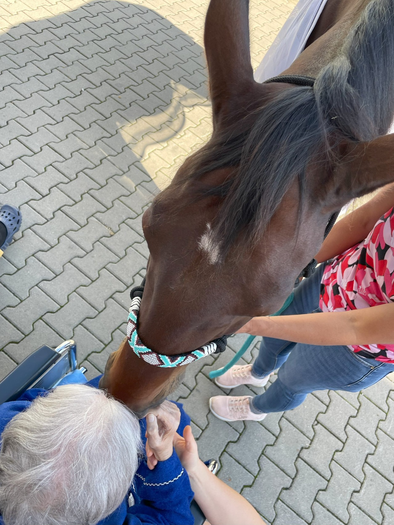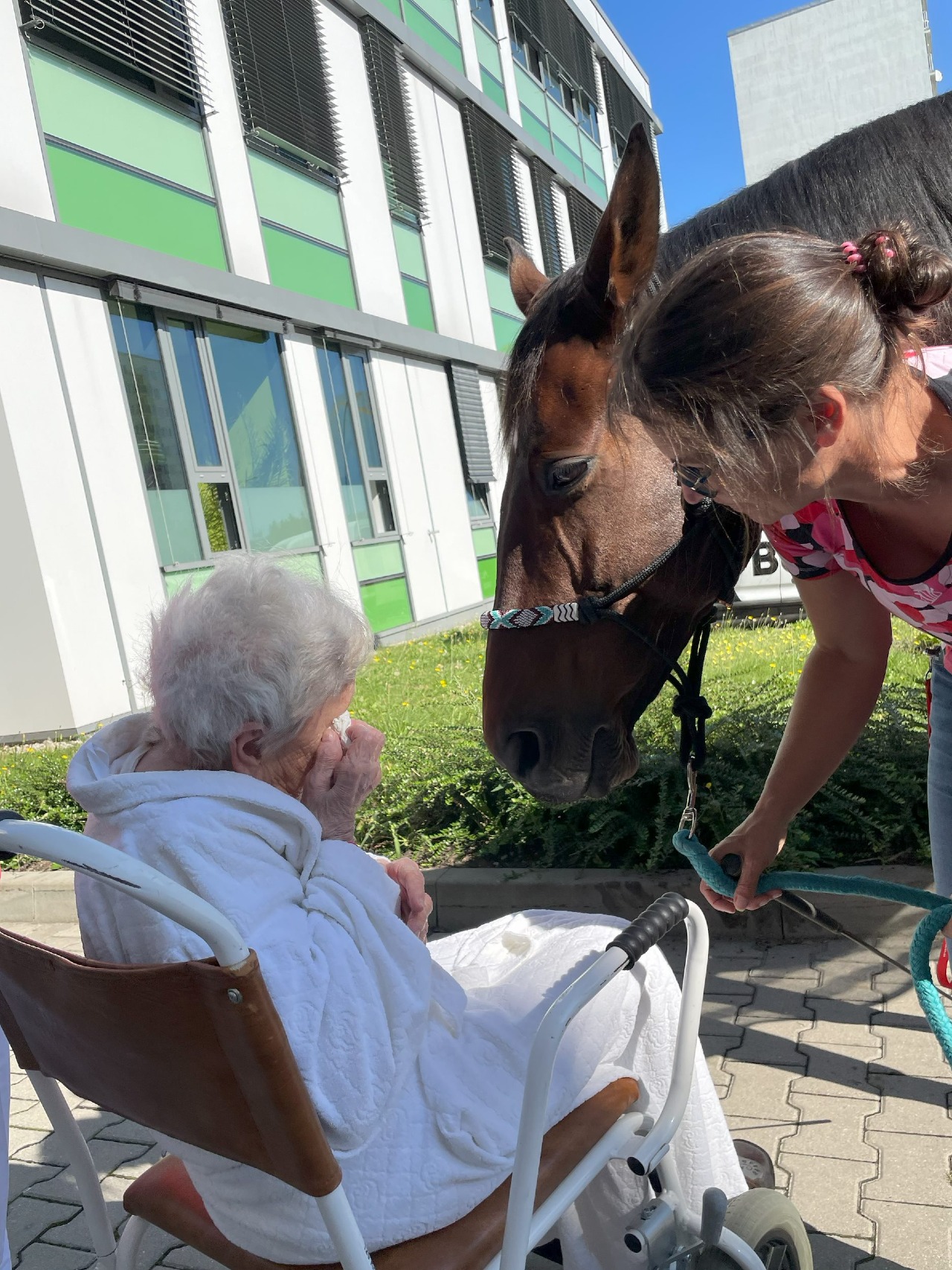 „Ty jsi za mnou zase přijel! Já jsem se na tebe tak těšila,“ šeptala pacientka oddělení následné péče Sagimu, která se s ním potkala již podruhé během svého pobytu v Klaudiánově nemocnici. Poprvé se na koně dokonce těšila tak moc, že byla - k radosti personálu - ochotná se najíst. Teď nadšeně povzbuzovala sestřičky, aby jí pomohly zvednout ruku, aby se koně mohla dotknout. Seniorky, které se s koněm během úterní návštěvy potkaly, měly všechny problém s hybností horních končetin. Ale koník je všechny do jedné motivoval k tomu, aby se snažily s pomocí personálu koně dotknout, pohladit nebo obejmout. „Slib mi, že za mnou zase přijedeš,“ šeptala pacientka a loučila se se Sagim polibkem na čumák.